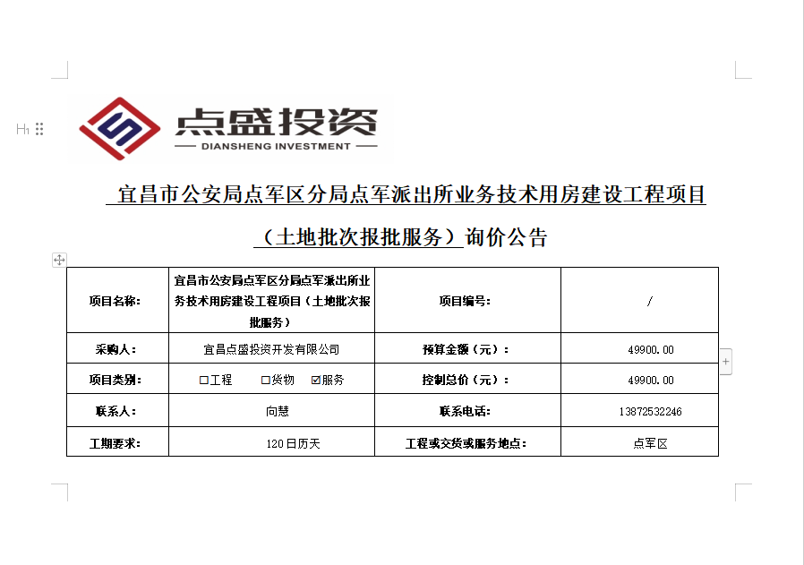宜昌市公安局點軍區(qū)分局點軍派出所業(yè)務技術(shù)用房建設工程項目 (土地批次報批服務)詢價公告