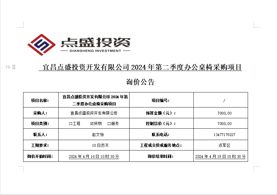 宜昌點(diǎn)盛投資開(kāi)發(fā)有限公司2024年第二季度辦公桌椅采購(gòu)項(xiàng)目 詢價(jià)公告