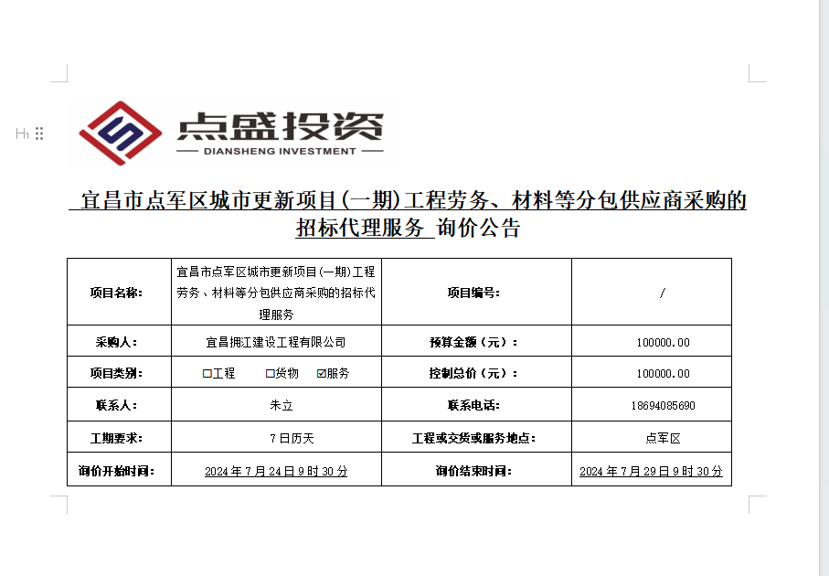 宜昌市點(diǎn)軍區(qū)城市更新項(xiàng)目(一期)工程勞務(wù)、材料等分包供應(yīng)商采購的招標(biāo)代理服務(wù)詢價(jià)公告
