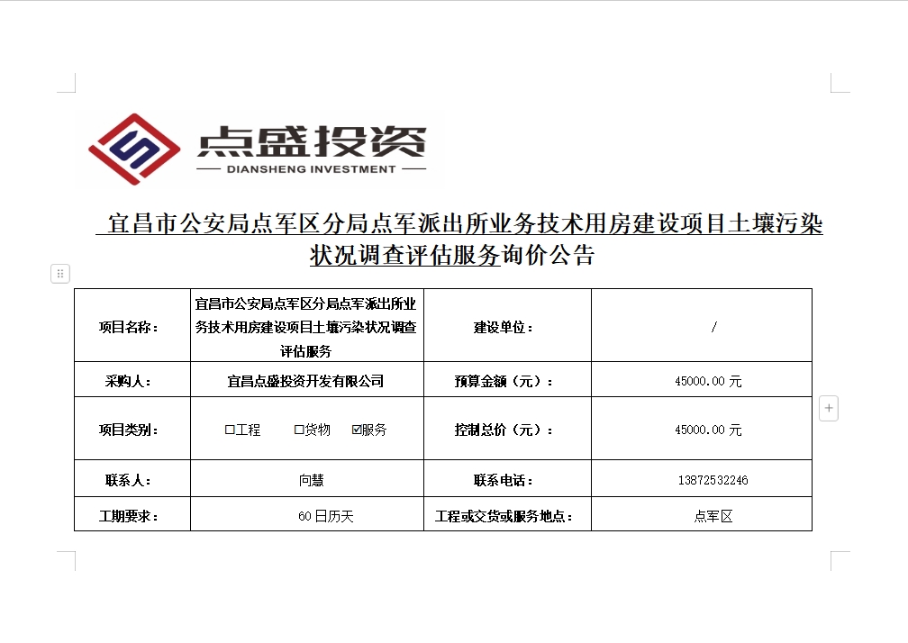 宜昌市公安局點軍區(qū)分局點軍派出所業(yè)務(wù)技術(shù)用房建設(shè)項目土壤污染狀況調(diào)查評估服務(wù)詢價公告