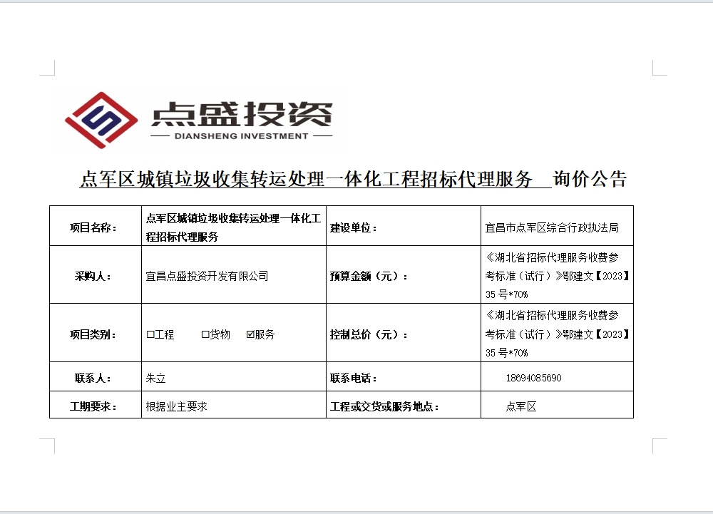 點軍區(qū)城鎮(zhèn)垃圾收集轉(zhuǎn)運處理一體化工程招標代理服務(wù)詢價公告